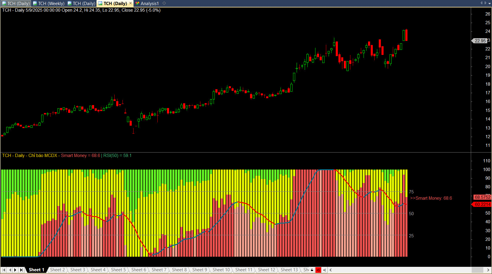 Chỉ báo MCDX cho Amibroker là một công cụ mô phỏng hành vi dòng tiền thông qua sự vận động của động lượng giá. Điều quan trọng cần nhấn mạnh là MCDX không đo lường trực tiếp dòng tiền thực tế của từng nhóm nhà đầu tư. Trên thị trường chứng khoán, dữ liệu chi tiết để phân loại chính xác dòng tiền theo tổ chức hay cá nhân không tồn tại dưới dạng công khai.