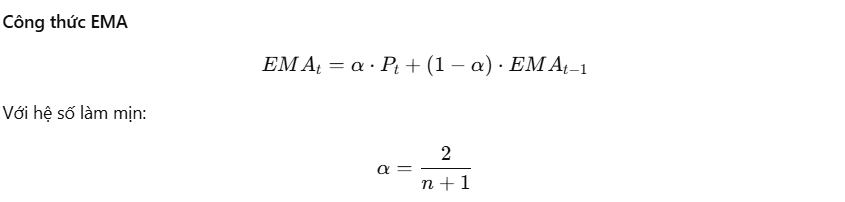 EMA (Exponential Moving Average) là đường trung bình động hàm mũ, trong đó giá ở các phiên gần hiện tại được gán trọng số lớn hơn.