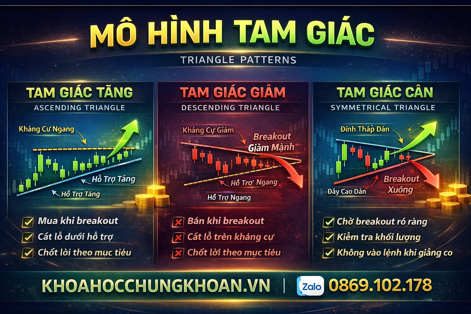 Việc hiểu và ứng dụng đúng mô hình tam giác sẽ giúp nhà đầu tư xác định điểm vào lệnh, cắt lỗ và chốt lời hiệu quả hơn, đặc biệt trong giao dịch ngắn hạn và trung hạn.
