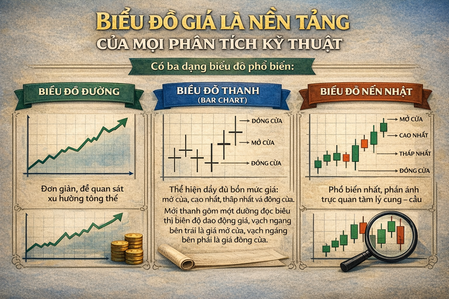 Biểu đồ giá là nền tảng của mọi phân tích kỹ thuật. Có ba dạng biểu đồ phổ biến:
