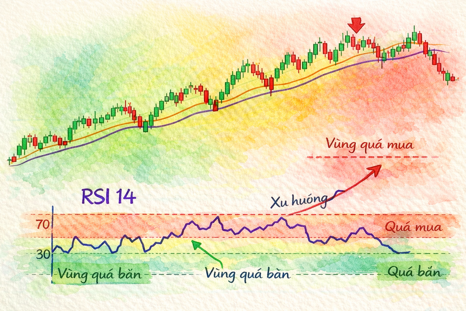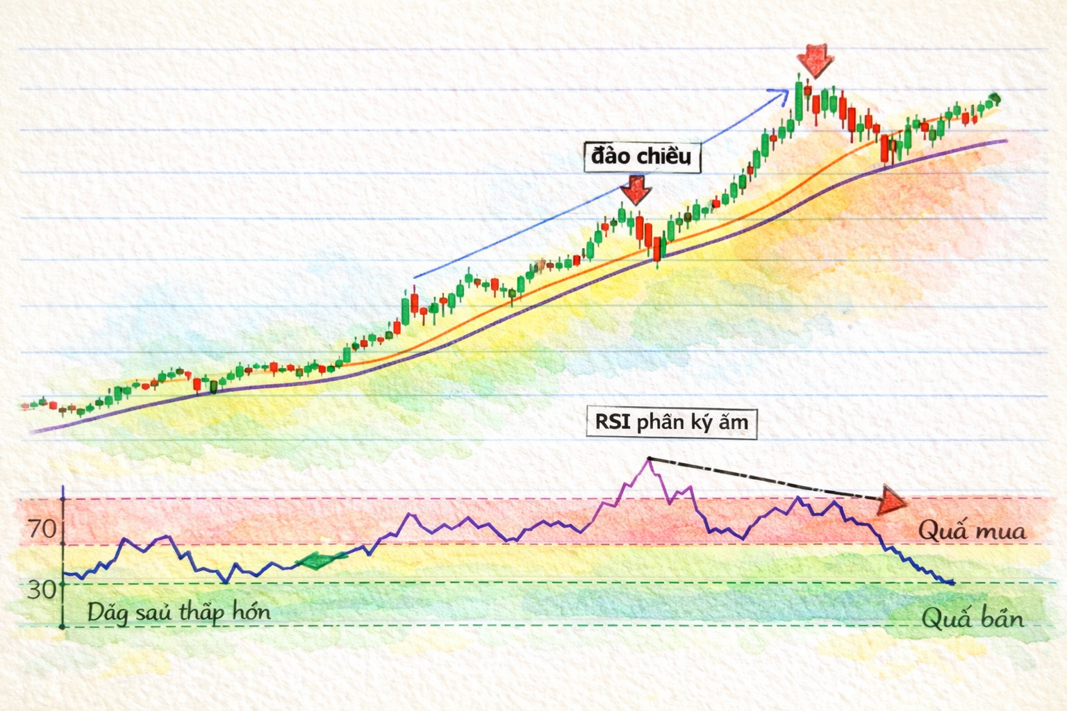 Phân kỳ âm: giá tạo đỉnh cao hơn nhưng RSI tạo đỉnh thấp hơn → khả năng đảo chiều giảm